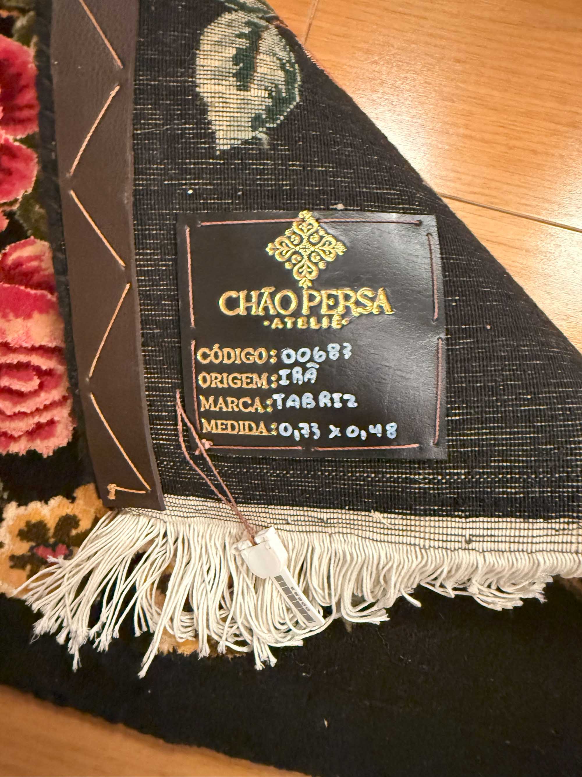 Este conjunto de 4 tapetes Tabriz é uma verdadeira joia da tapeçaria persa, trazendo a beleza dos painéis florais clássicos, característicos da escola de Tabriz. Tecelados à mão com lã de altíssima qualidade, cada exemplar apresenta um fundo negro profundo que valoriza a riqueza cromática das flores, executadas em tons vibrantes de vermelho, rosa, amarelo, verde e bege.
